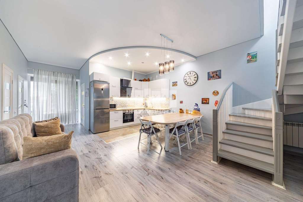 Первый этаж занимает великолепная кухня - гостиная, спальня и второй санузел с душевой кабиной. 20-ти метровая теплая веранда с панорамным остеклением, оборудована выходом на террасу и к мангальной зоне.